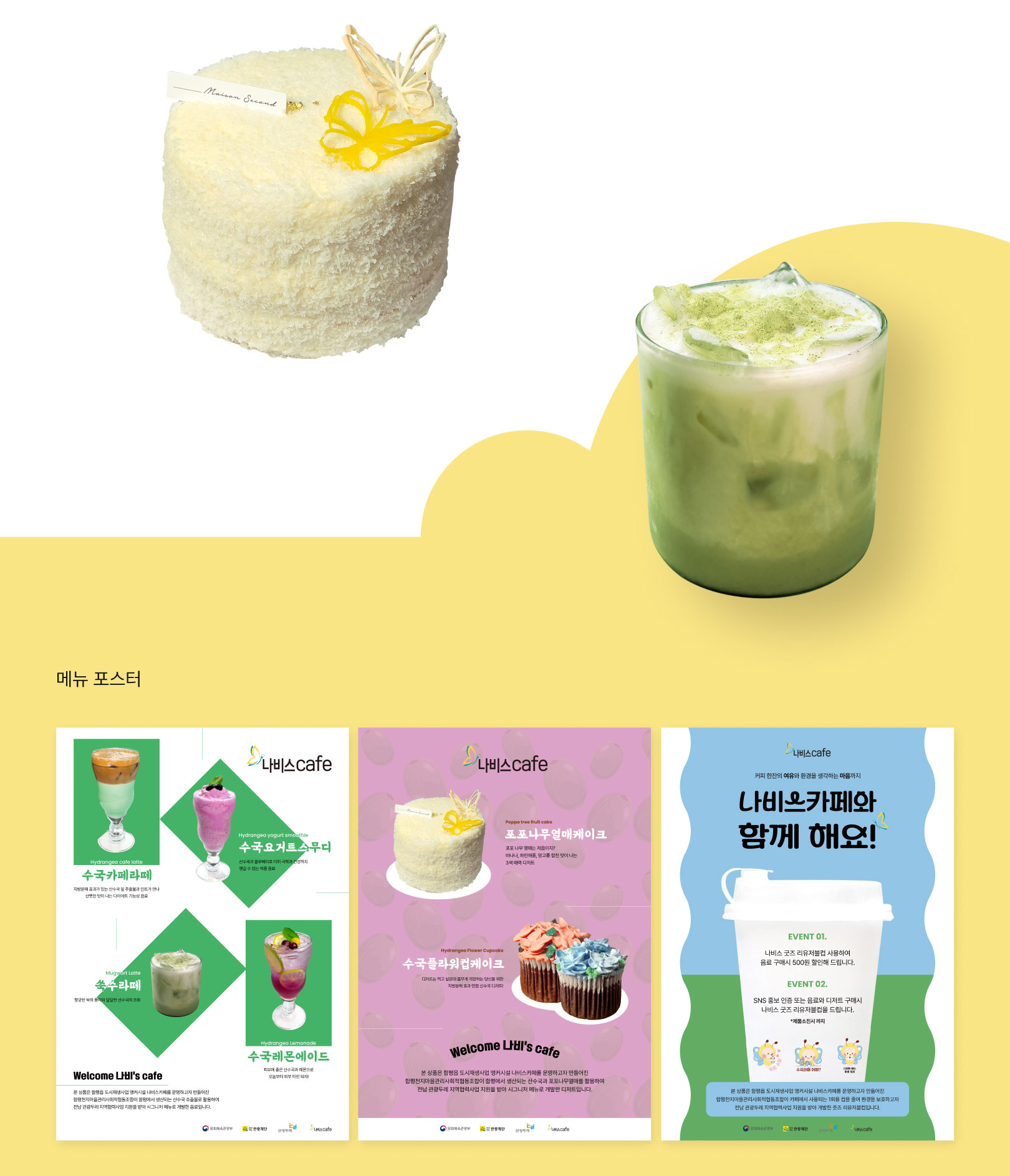 나비스 카페만의 시그니처 음료와 디저트는 직접 촬영한 후 포스터와 메뉴판에 활용하였습니다.